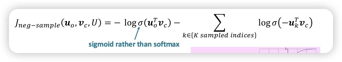- 무작위로 샘플링한(negative) 단어들이 등장하지 않을 확률을 최대화합니다.
