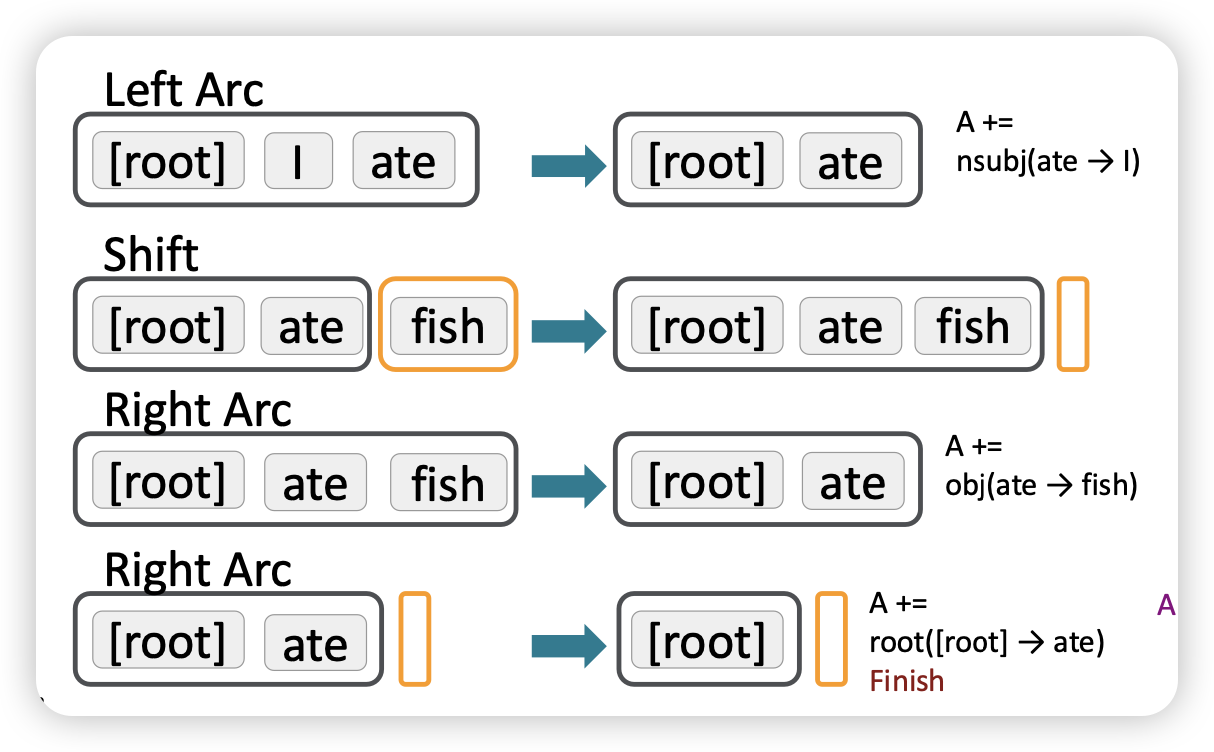 • shift, reduce left-arc, reduce right-arc 중 하나를 선택함