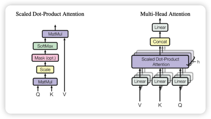 왼쪽 그림은 한 head에서의 attention 계산 과정을 보여주고, 오른쪽은 여러 head에서 계산한 결과를 concat하고 projection하는 전체 구조
