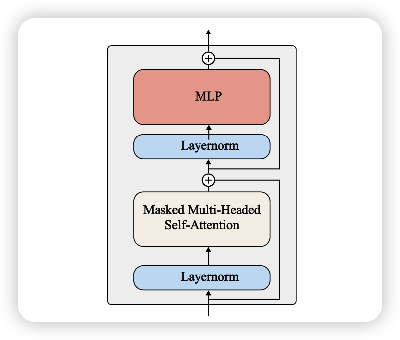 GPT-2 small 모델은 총 12개의 decoder-style Transformer block으로 구성됨 각 block은 다음과 같은 구성 요소로 이루어져 있음