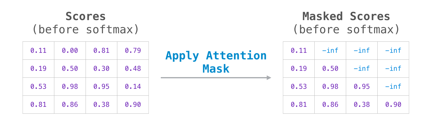- softmax 적용 시 미래에 대한 attention weight가 0이 되도록 만듦